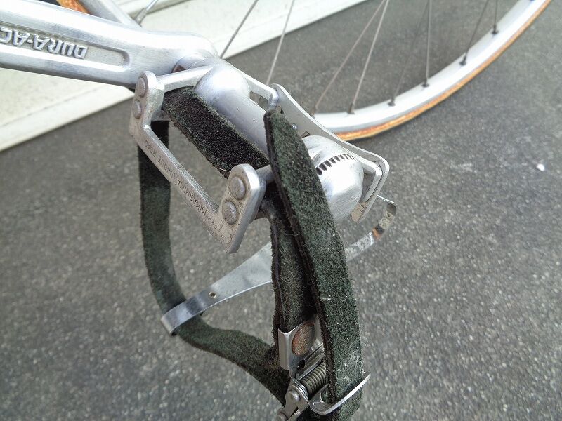 ↑ペダルは三ヶ嶋ユニークがつけてあります。年代は1976年頃の物ですが、見てのとおり、後ろ側のプレート、キャップを削り込んで軽量化しています?(笑)この頃のピストなら三ヶ嶋のユニークか極東のプロエースがほとんどでしょう。