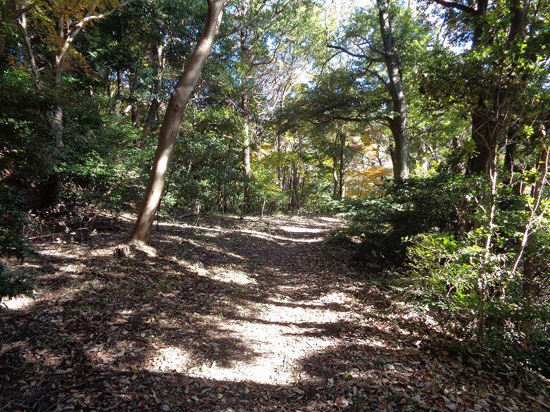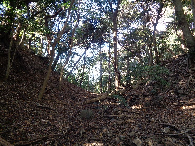 ↑尾根に出ました。明確な赤岩城の痕跡はわかりませんでしたが、いかにも人工的に見えるこの辺りの地形が赤岩城の跡のようです。